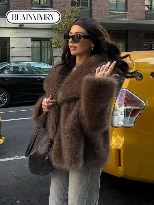 Solid Fluffy Faux Fur Women Thick Coat Fashion Warm Lapel Long Sleeve Short Jackets 2024 Winter Female Elegant Street Outerwear